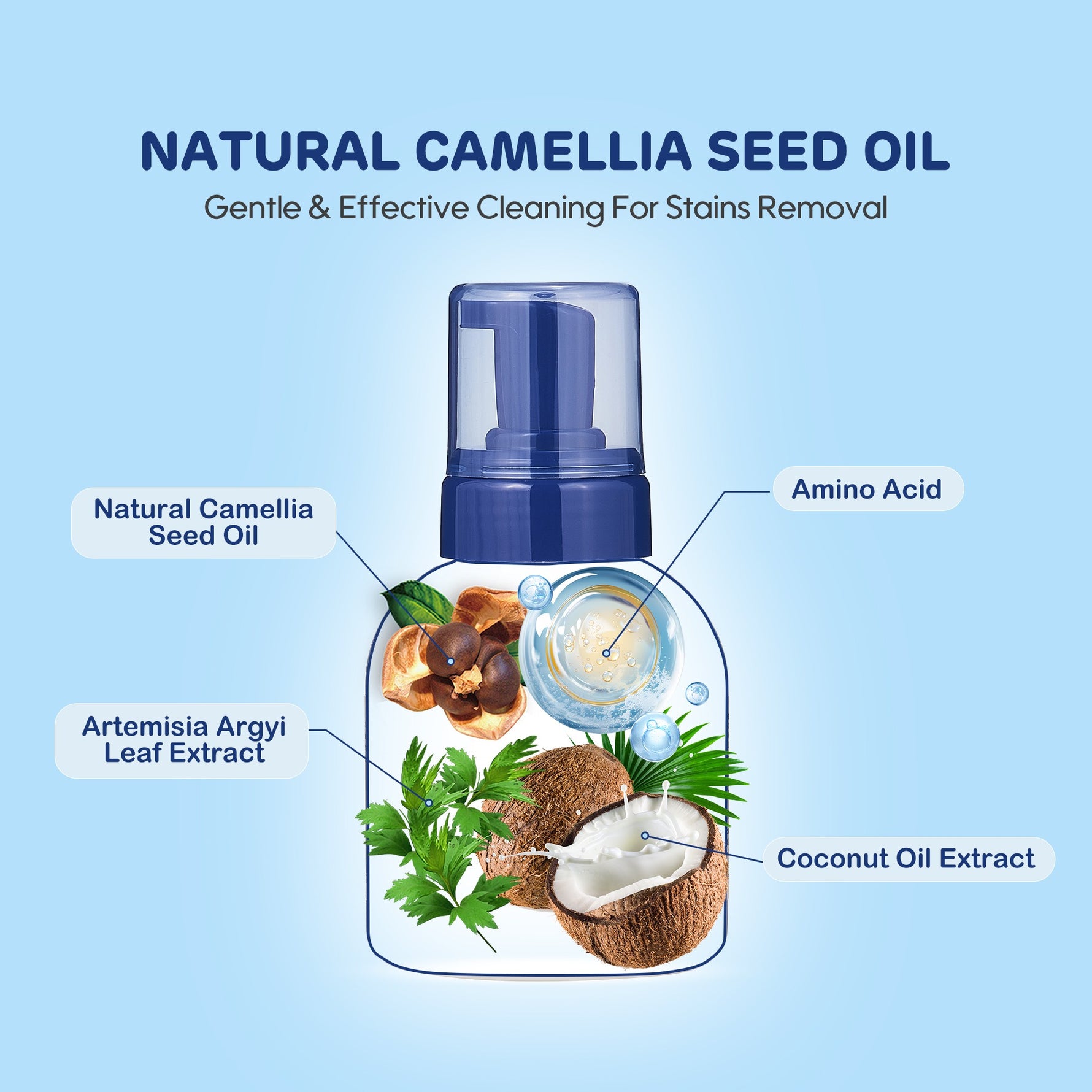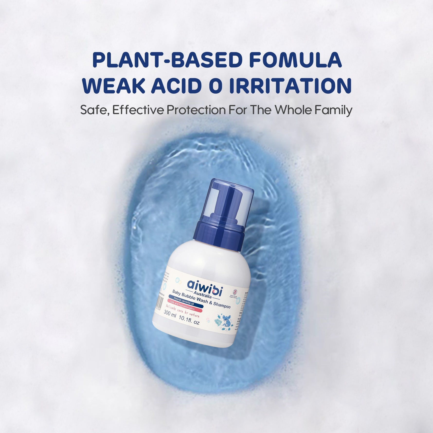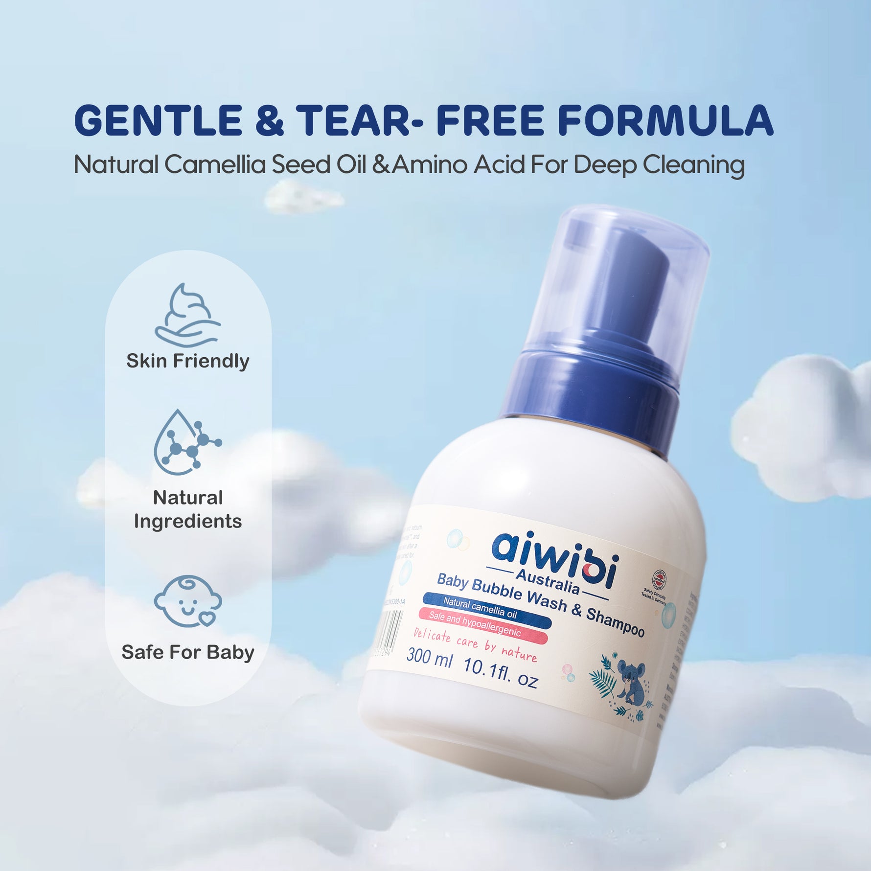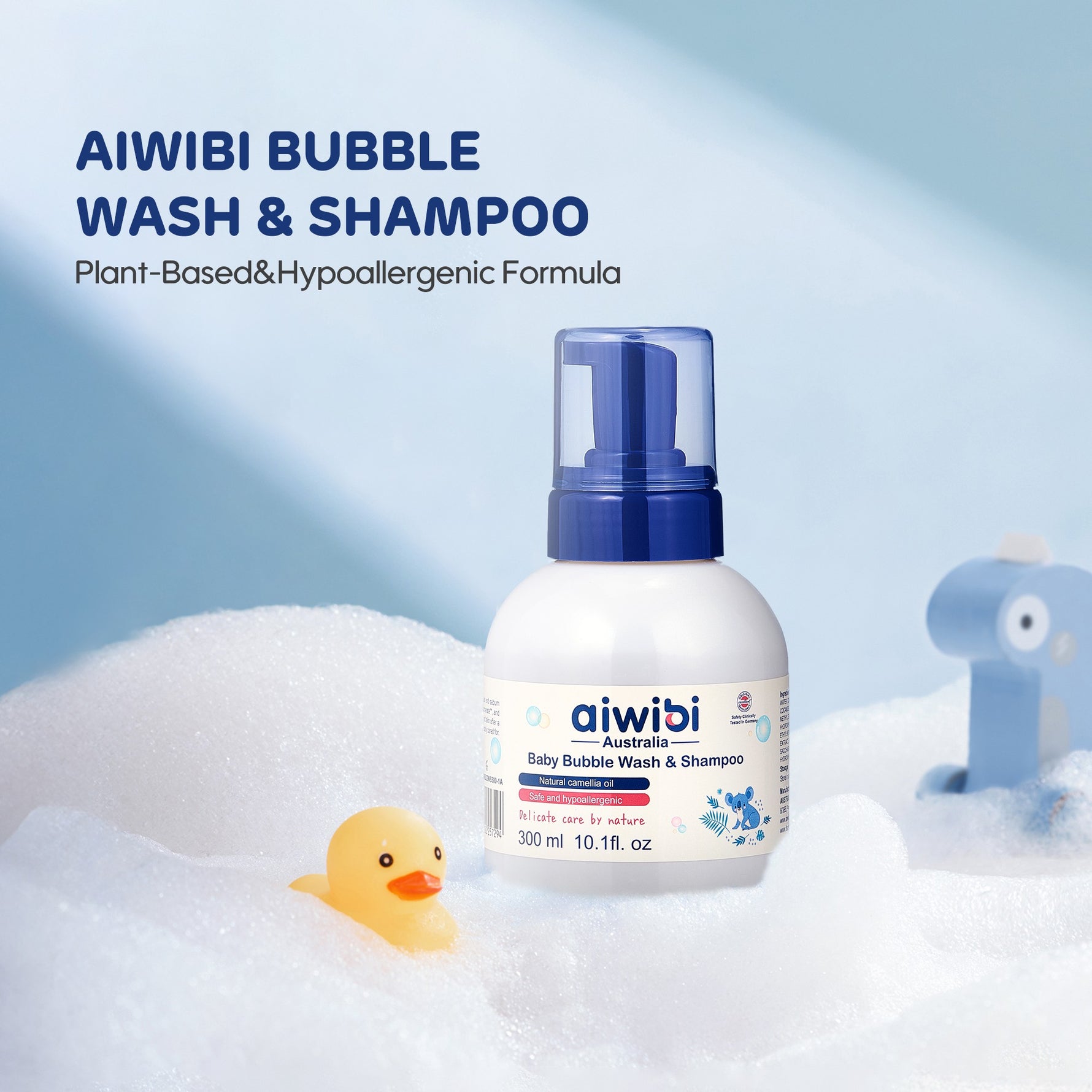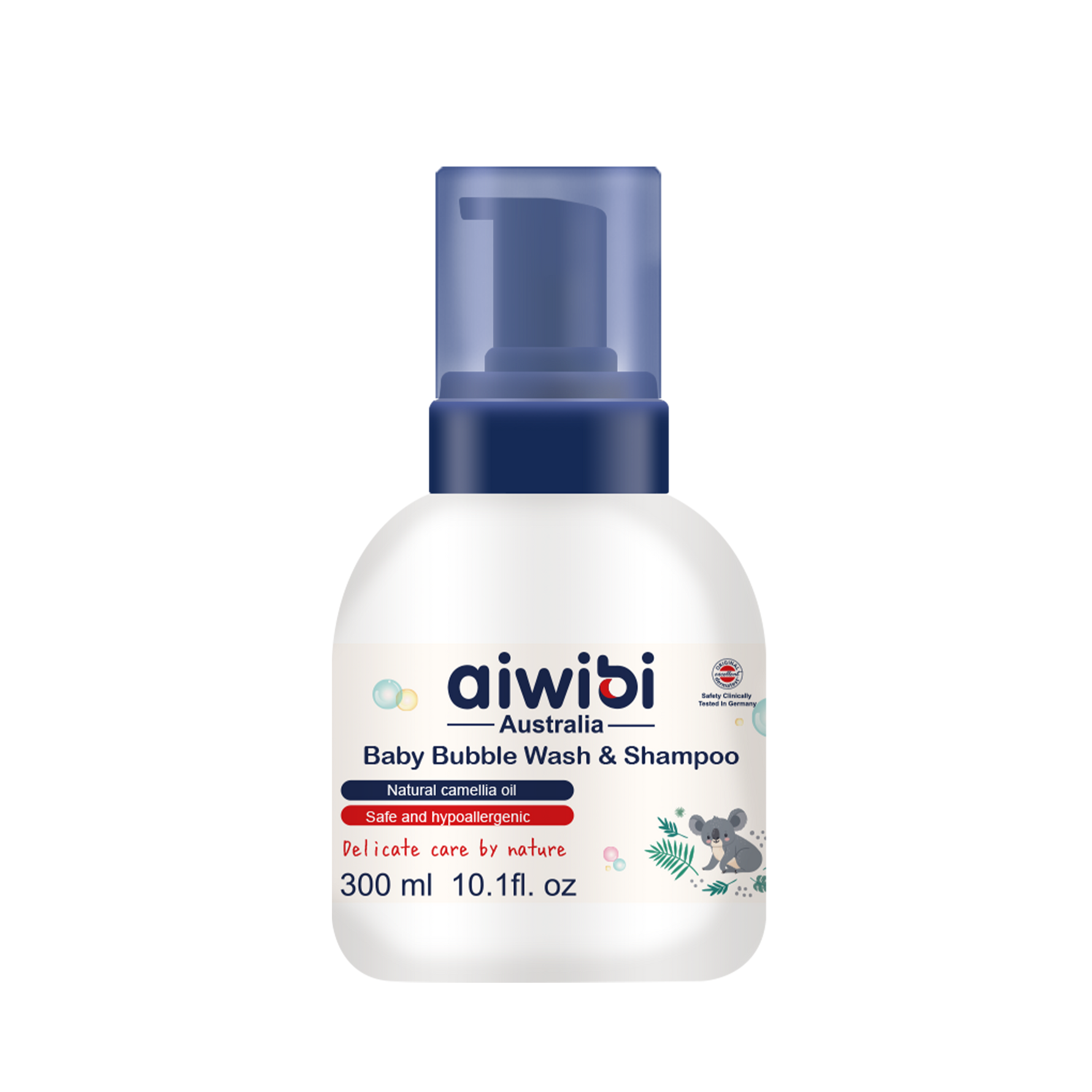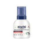 Aiwibi Bubble Wash & Shampoo features a plant-based, hypoallergenic formula enriched with natural camellia seed oil, making it gentle and safe for your baby’s sensitive skin.