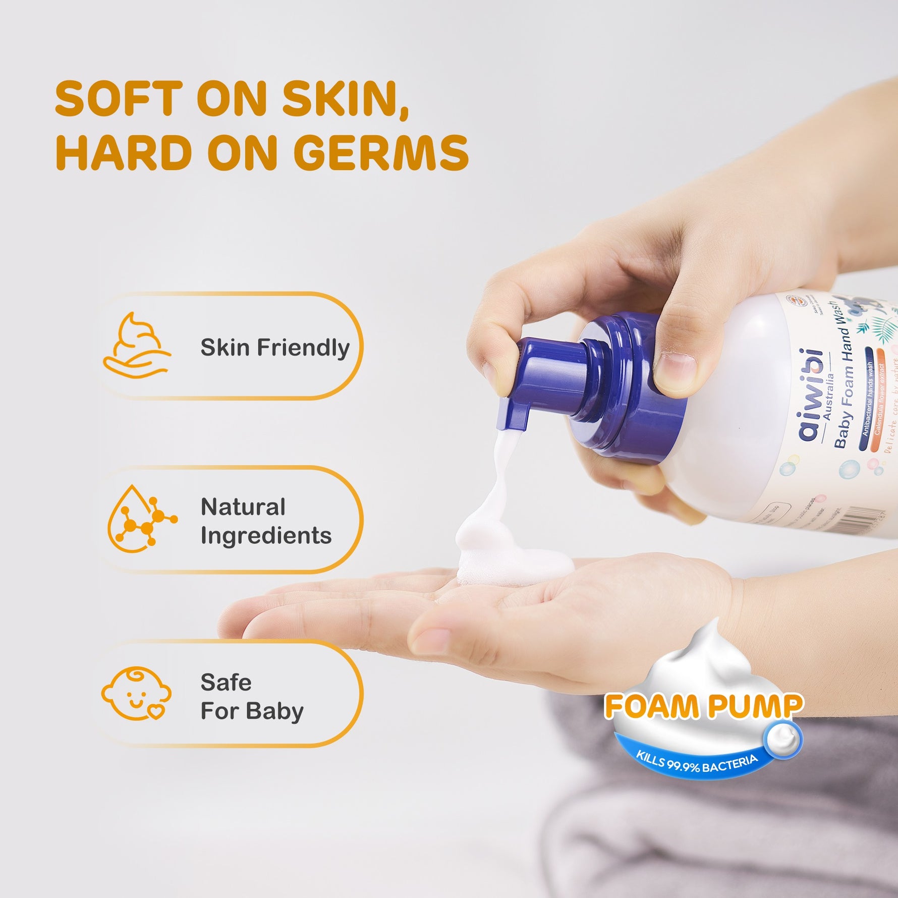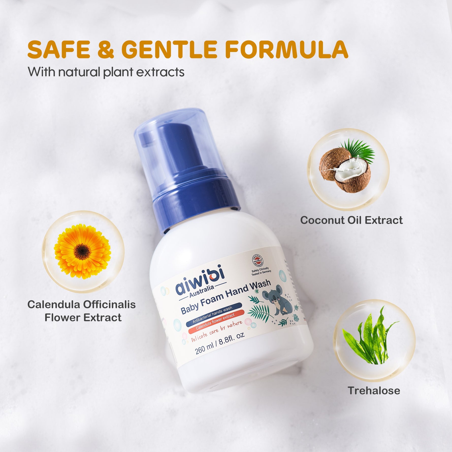 Aiwibi Baby Foam Hand Wash is enriched with natural plant extracts like calendula and coconut oil, providing a gentle and safe formula for everyday use.