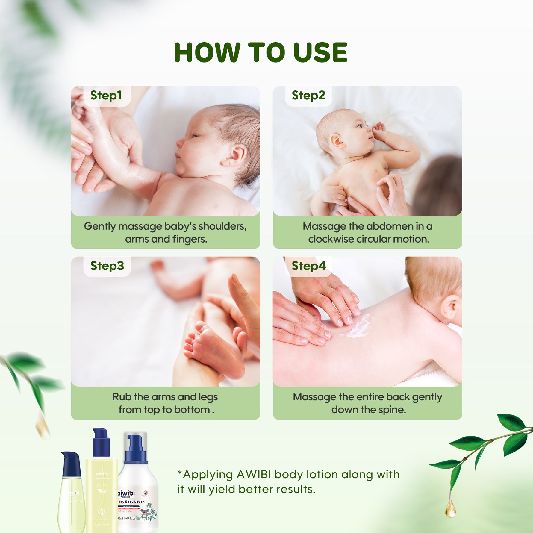 Aiwibi Baby Massage Oil is great for baby massage and parent-baby bonding and has clinically proven to have a moisturizing and soothing effect on your baby's skincare.