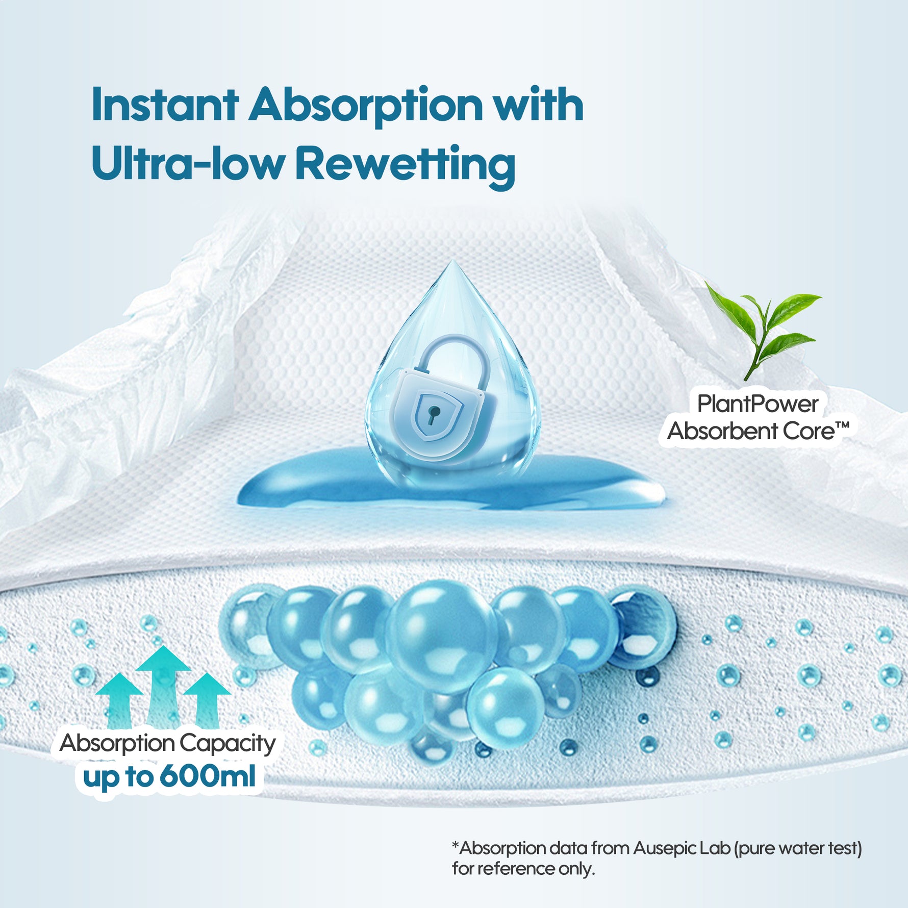 Quick-channeling layer rapidly directs liquid into absorption core, ensuring fast absorption to keep your baby’s skin dry and significantly reduce the risk of diaper rash.